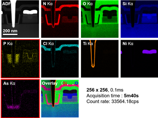 - Dual detector EDS (Energy-dispersive x-ray spectroscopy)를 장착하여 atomic level의 성분분석(color mapping, line profile 등)을 통한 화학조성 분석 가능